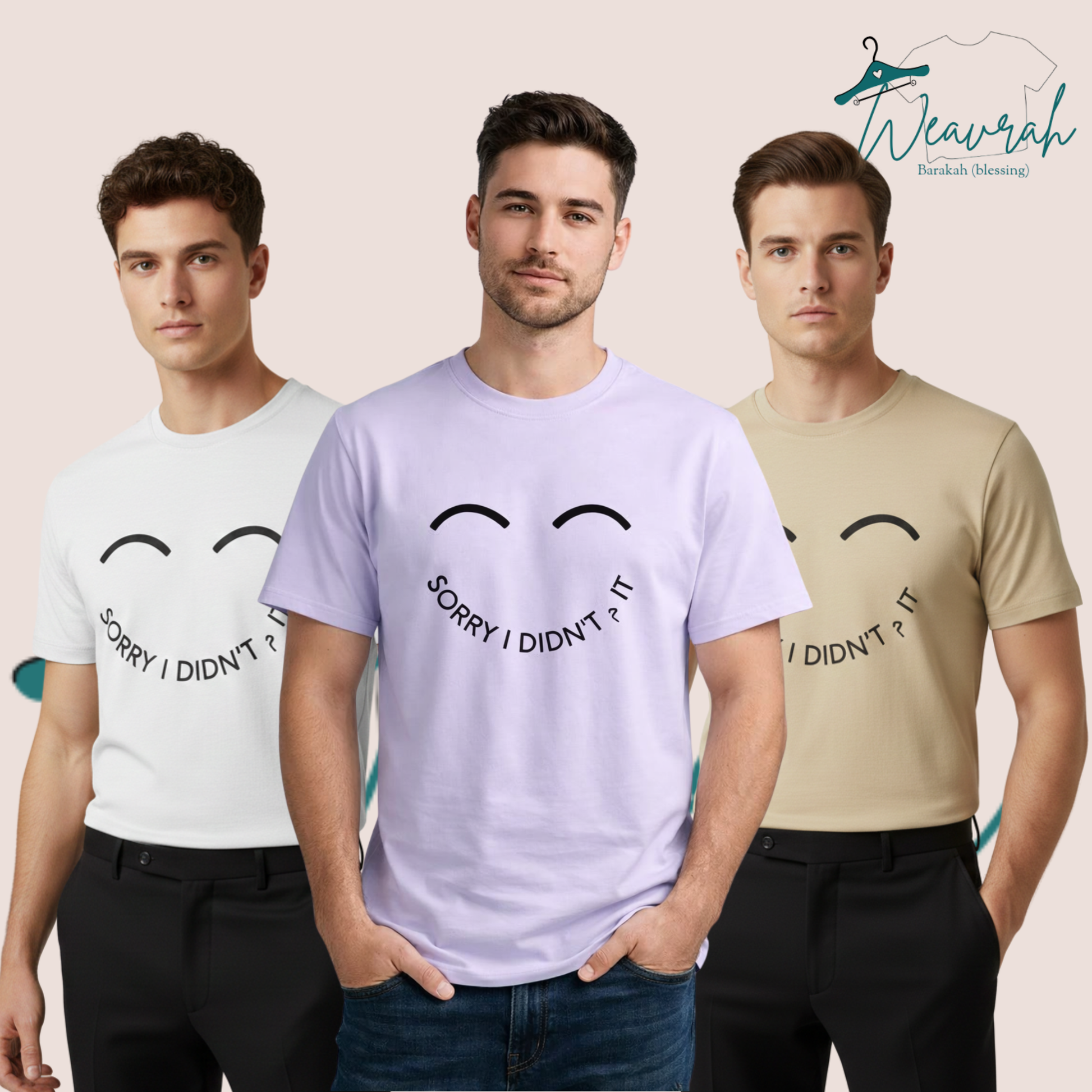 a minimalist smile design with closed eyes and the playful statement “SORRY I DIDN’T MEAN IT” curved into a subtle grin. It’s tTee.he perfect mix of cute and sarcastic — made for those who say less but mean more